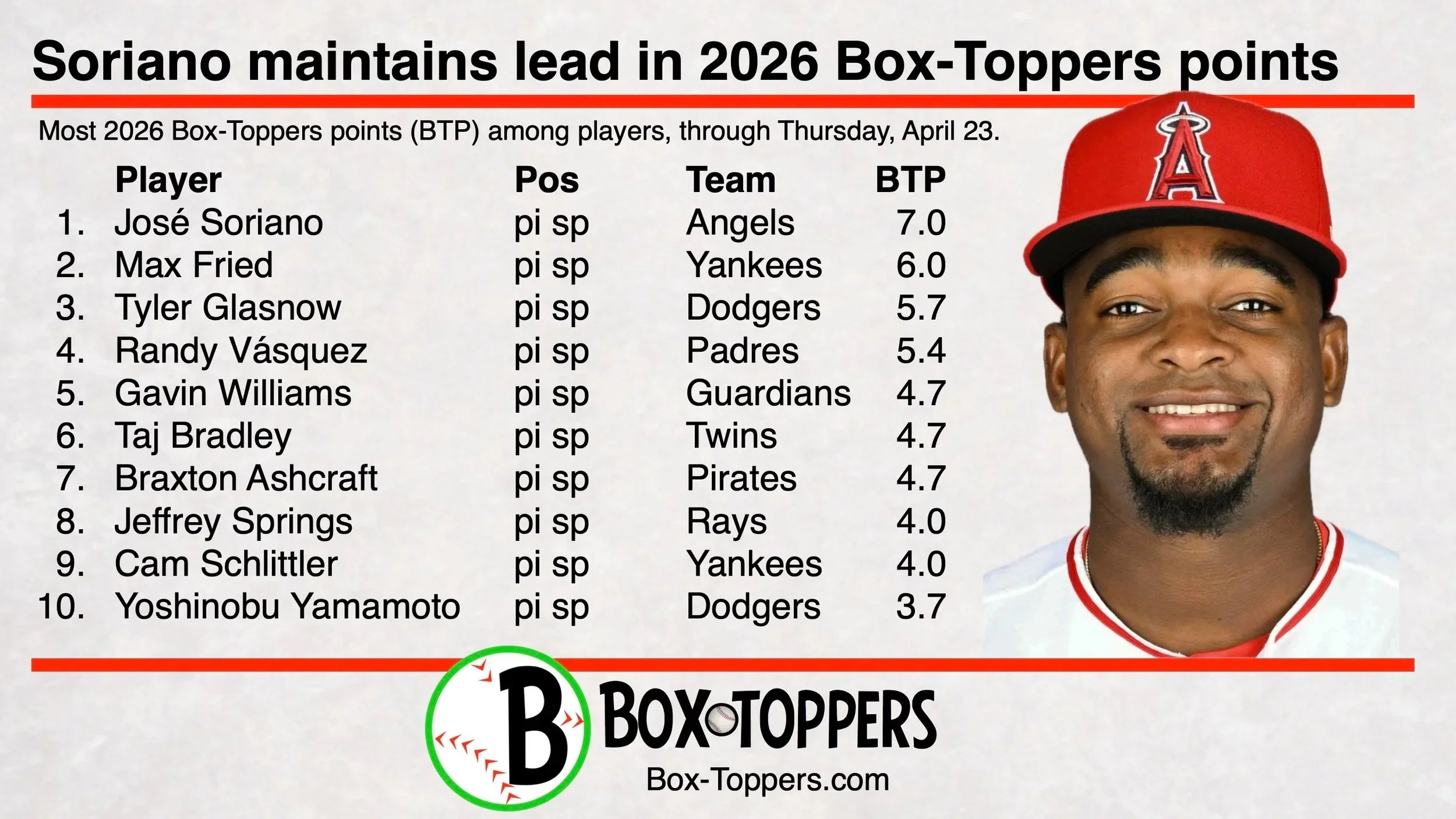 Dodgers pitcher Tyler Glasnow is Thursday’s Box-Toppers Player of the Day, rising to third place in season player rankings. Details.