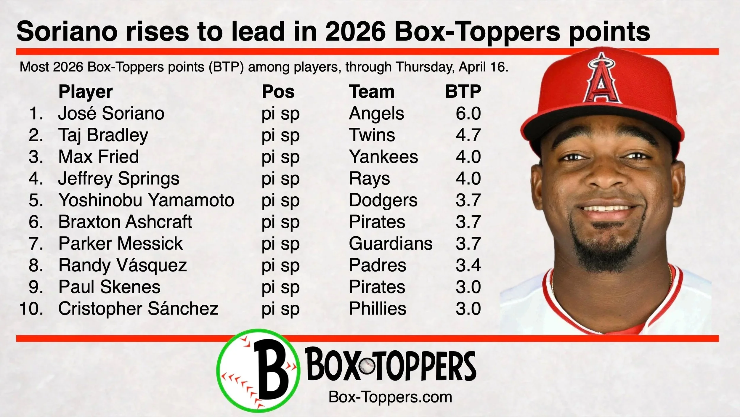 Here are the top 10 players in 2026 Box-Toppers points (BTP) earned in the regular season through Thursday, April 16.| Player | Pos | Team | BTP | |
