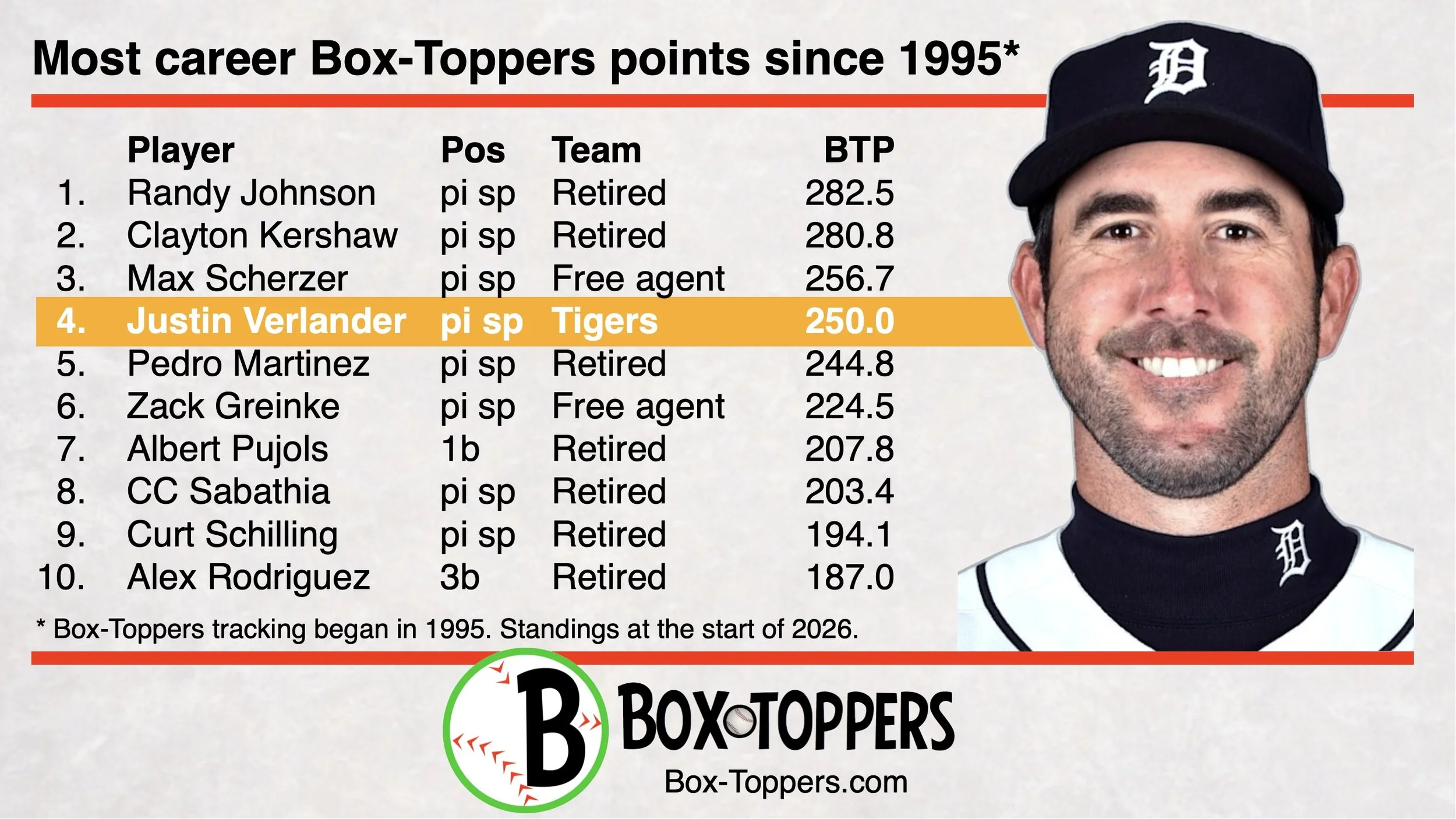 Randy Johnson holds the record for most Box-Toppers points in a single season with 33.7, which he achieved twice—in 2000 and 2002. Here are all players who have earned 25 or more Box-Toppers points in a single season since 1995, ranked by their single-season Box-Toppers point total.| Player | Team | Pos | Year | BTP | |