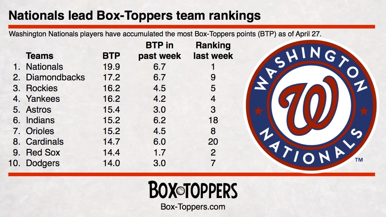 The Nationals’ 6.7 points in the past week is tied for the most with the Diamondbacks, which rose from ninth to second place among all teams with 17.2 Box-Toppers points.