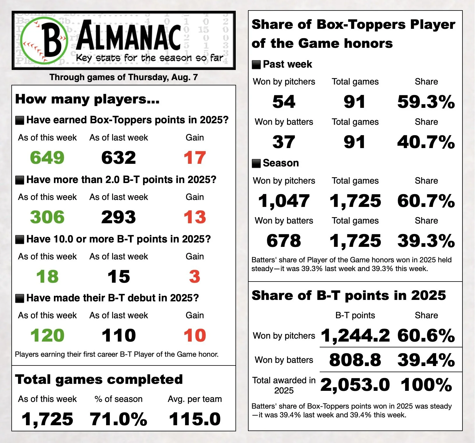 Batters’ share of Box-Toppers points earned this season held steady at 39.4 percent this week (808.8 points out of 2,053.0 total awarded). Pitchers have won 60.6 percent of all points.