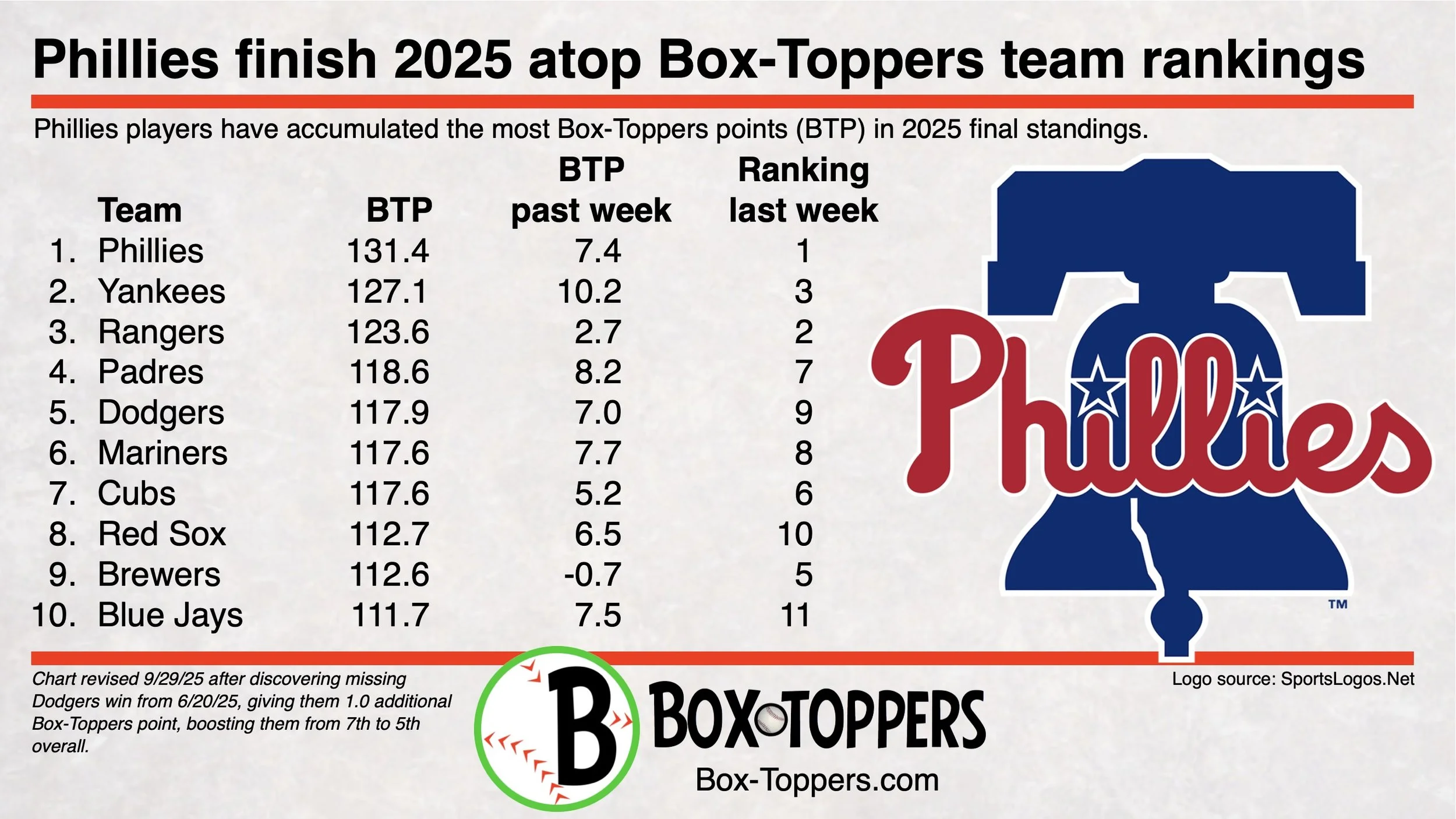 ▶︎The Philadelphia Phillies led all teams in 2025 Box-Toppers points (131.4).