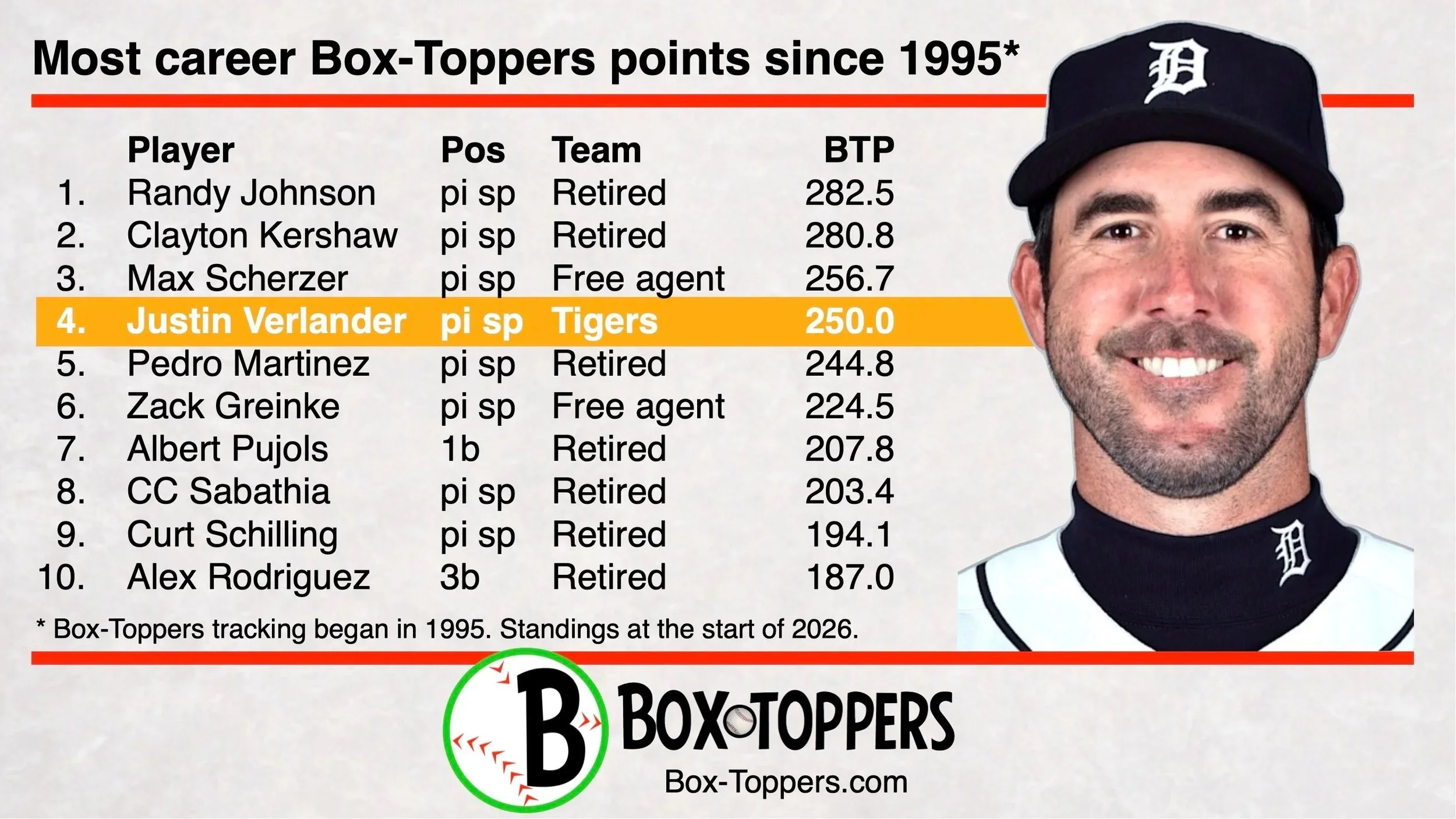 Justin Verlander (Tigers): Signed a one-year, $13 million deal. His 250.0 career Box-Toppers points rank fourth-most since 1995 and second among this year's free agents. He earned 148.0 of his career points during his first Detroit stint (2006–17). He was Box-Toppers Player of the Year twice, leading all players in points in 2012 with the Tigers (24.8) and in 2022 with the Astros (27.5).