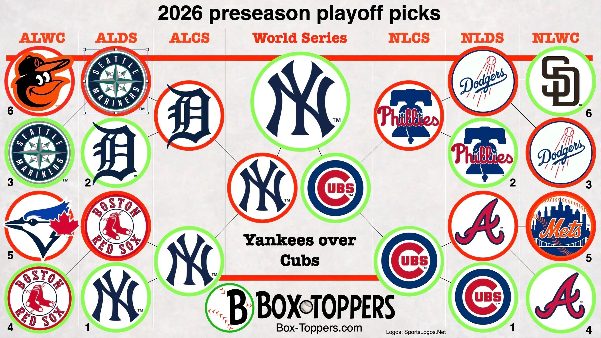 Box-Toppers picks the Yankees to beat the Cubs in the 2026 World Series. Here is the predicted order of finish of all 30 teams in their divisions and their projected win total.| American League | |||||||