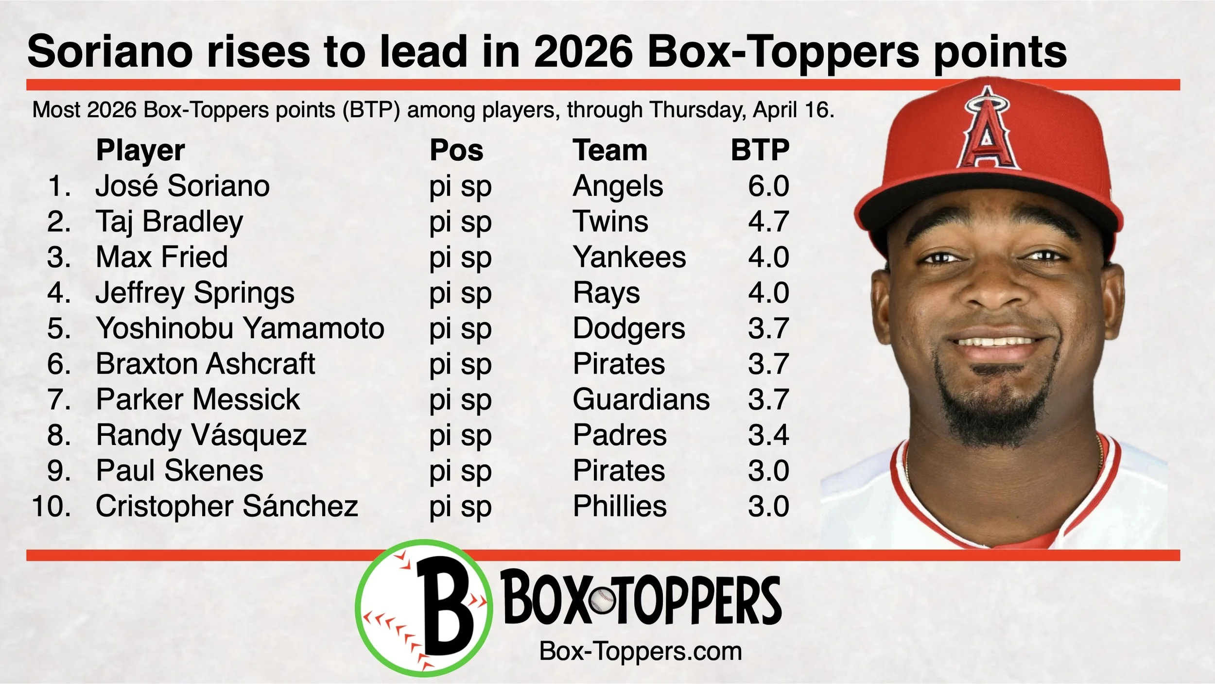 Soriano has 6.0 Box-Toppers points in 2026, rising from third place last week to first this week, passing last week’s leader Bradley, who falls to second with 4.7 points. Soriano also leads Bradley among AL pitchers.