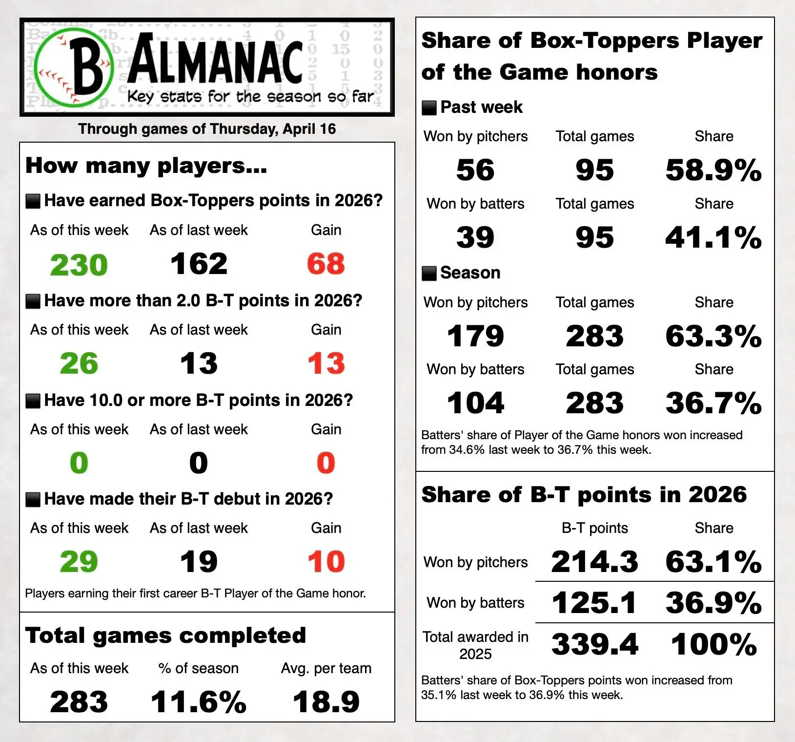 Box-Toppers tracks who contributes most to their team’s victory. Using standard box score statistics, we identify the Player of the Game for every MLB contest. In the regular season, winners earn 1.0 Box-Toppers point, with bonus points awarded to the top overall and league-specific players of the day. More on how Box-Toppers works.