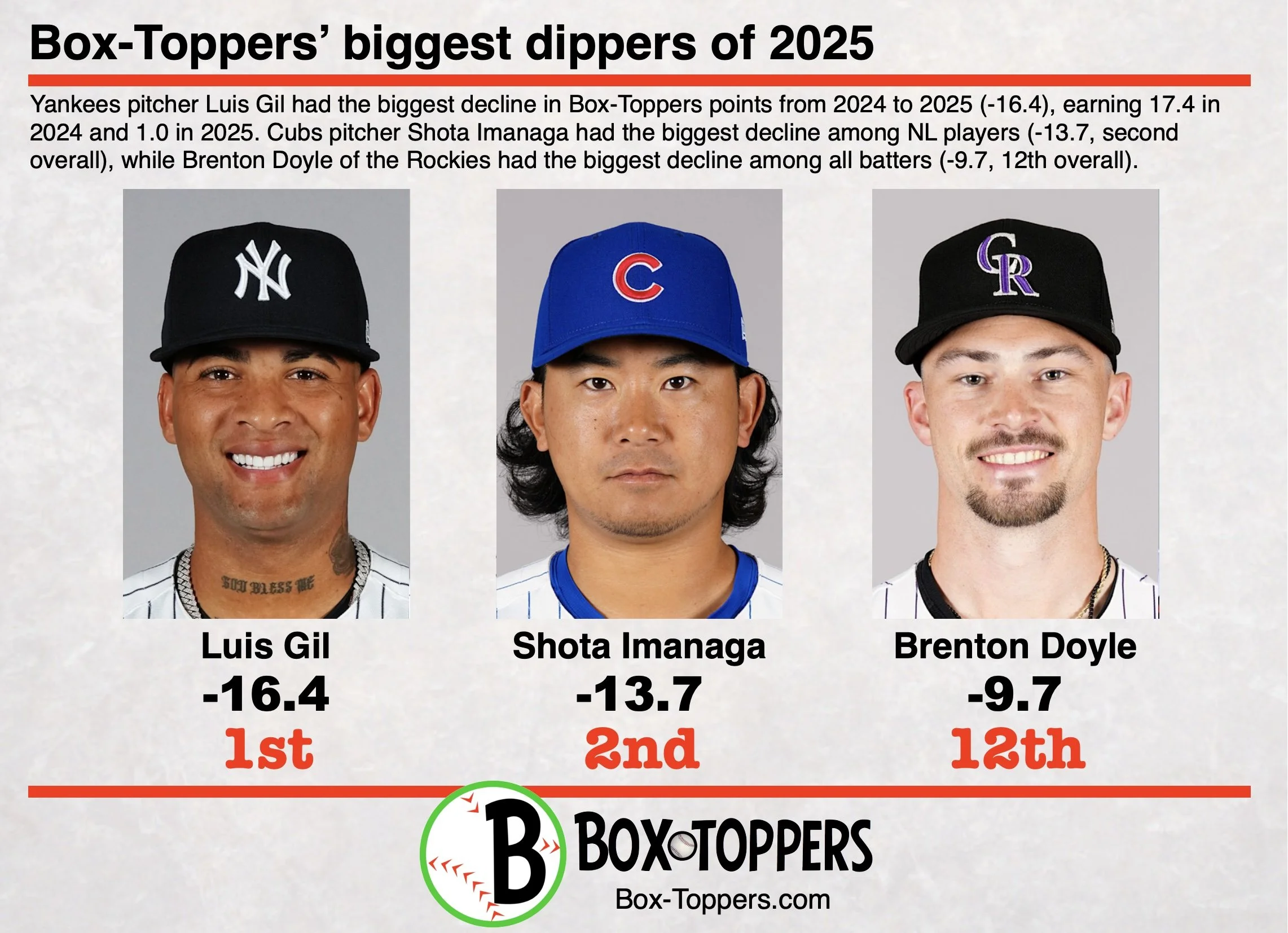Randy Johnson holds the record for most Box-Toppers points in a single season with 33.7, which he achieved twice—in 2000 and 2002. Here are all players who have earned 25 or more Box-Toppers points in a single season since 1995, ranked by their single-season Box-Toppers point total.| Player | Team | Pos | Year | BTP | |